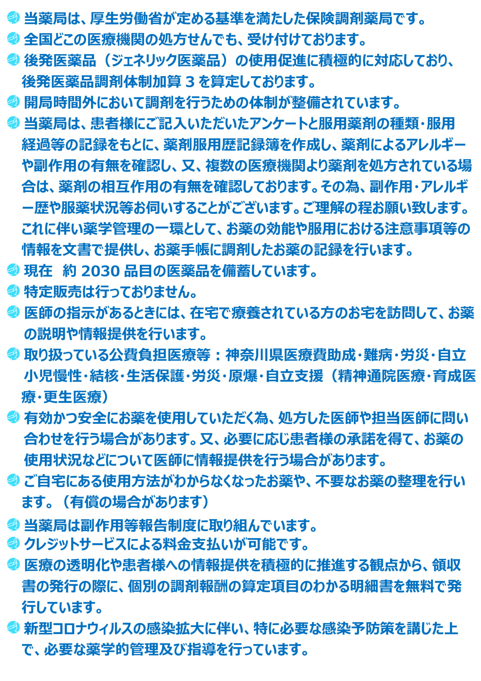 ・調剤基本料2 ・連携強化加算 ・後発医薬品調剤体制加算3 ・在宅薬学総合体制加算1 ・医療DX推進体制整備加算2 ・かかりつけ薬剤師指導料及びかかりつけ薬剤師包括管理料 ・在宅患者訪問薬剤管理指導料