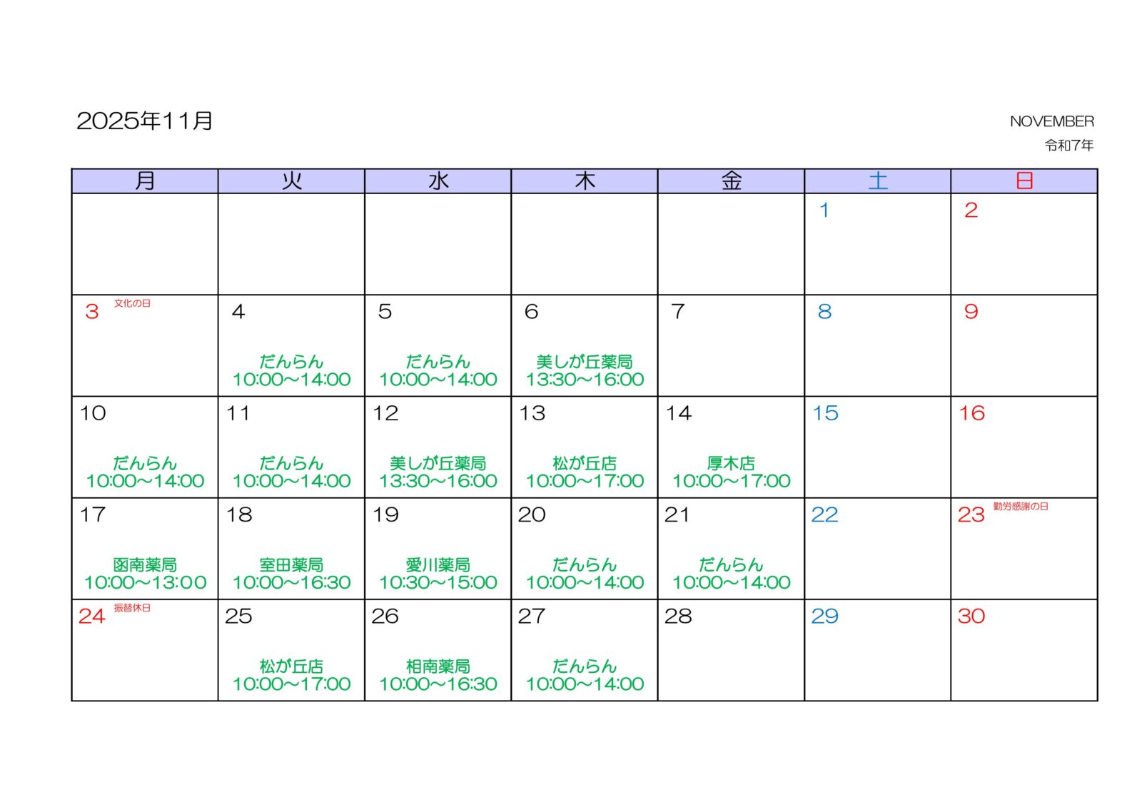 各店お問い合わせ先 ・だんらん/追分薬局 0463-35-4711 ・美しが丘薬局 045-905-5602 ・松が丘店 0467-87-0123 ・厚木店 046-281-7672 ・函南薬局 055-979-6585 ・室田薬局 0467-54-8885 ・愛川薬局 046-285-9333 ・相南薬局 042-767-2820 お気軽にお問い合わせください。
